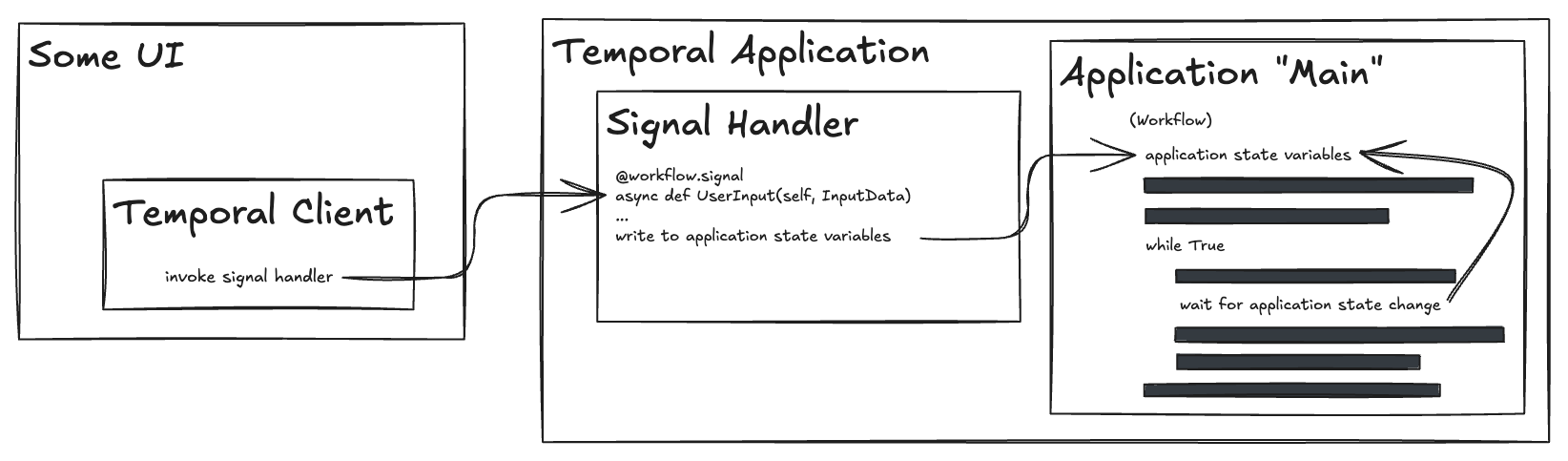 We use a Temporal signal to inject information from the human into the waiting workflow. The signal is delivered from some UI (in this case the send_approval.py script) that uses a Temporal client to deliver the data.
